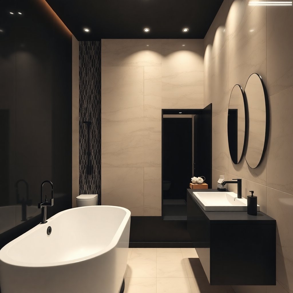 5. **Освещение:** Стильные черные светильники и удобные бра помогут создать необходимое освещение и значительно повлияют на атмосферу в ванной.